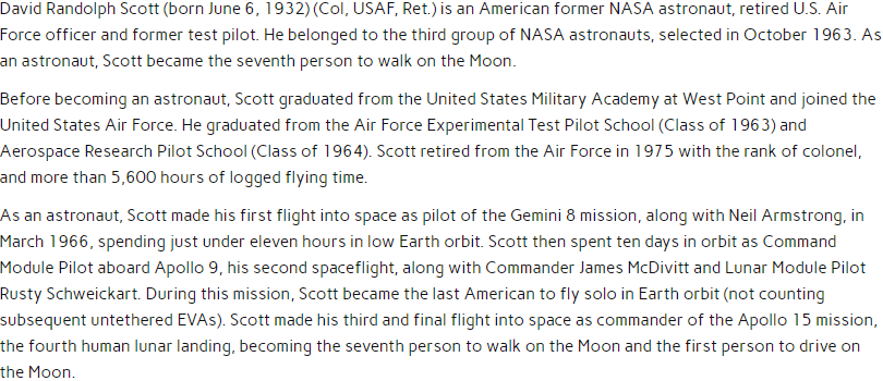 5. Scott was an alumnus of United States Military Academy, Air Force Experimental Test Pilot School and Aerospace Research Pilot School.