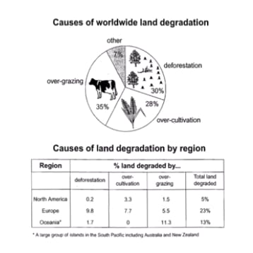 Answer – The pie chart introduces the main cause of worldwide land degradation in percentage scale, whereas the table shows reasons of land degradation by three regions: North America, Europe and Oceania. Overgrazing is the min reason of worldwide degradation and it reached 35%. 30% and 28% of degradation was due to deforestation and over-cultivation respectively, leaving 7% for other reasons. Most deforestation and over-cultivation occurred in Europe, while overgrazing was the main cause in Oceanic. In conclusion, overgrazing is the main cause of worldwide degradation and most degraded land is Europe.
